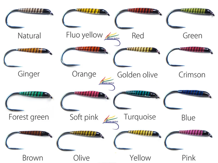 Stripped peacock quills have a specific color pattern from light to dark shade, which perfectly imitates the jointed body of an insect. This material gave the basis to the now very well-known types of flies called “Quill”.